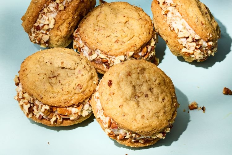 4. Assemble Sandwiches: Once the cookies are completely cool, choose two cookies of similar size for each sandwich. Place one cookie, flat side up, on your work surface. Scoop a generous amount of the slightly softened butter pecan ice cream onto the center of the cookie. Use an offset spatula or the back of a spoon to gently spread the ice cream to the edges. Place a second cookie on top, flat side down, and gently press down to create a sandwich. The ice cream will spread to the edges. Smooth the edges of the ice cream with an offset spatula if desired.