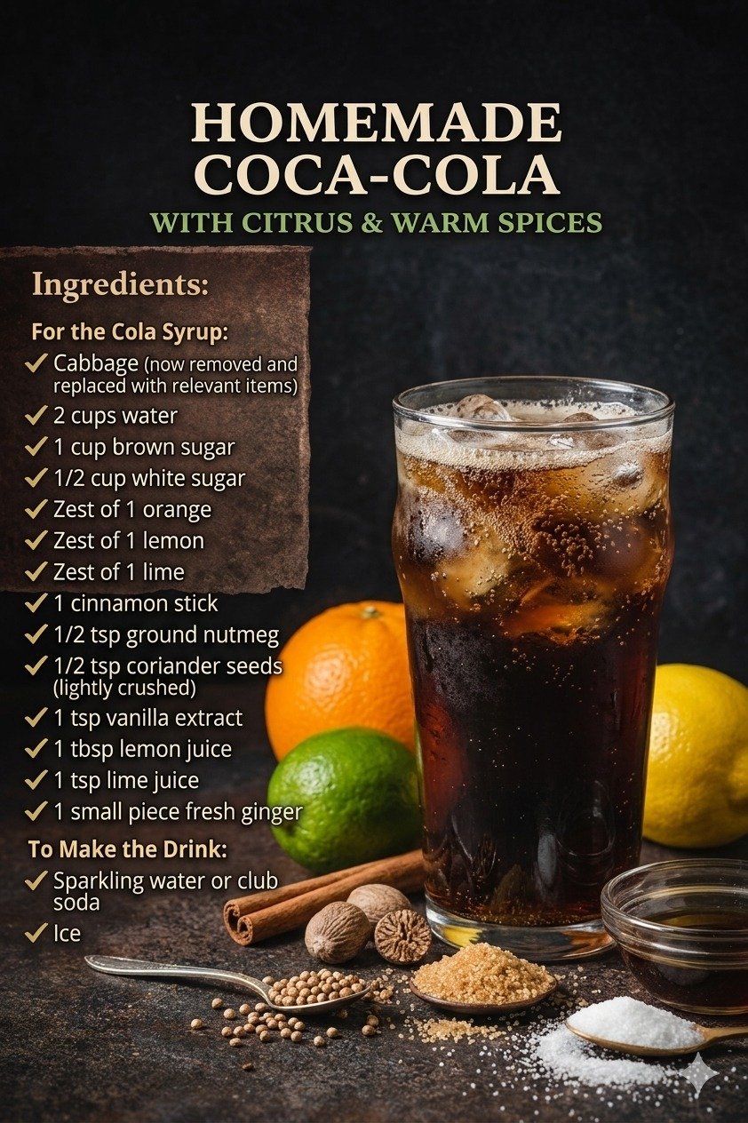 There’s something especially fun about making a classic soda flavor from scratch, and this Homemade Cola Syrup & Fizzy Cola Drink is a perfect example. It brings together caramel-like sweetness from brown sugar, bright citrus oils from orange, lemon, and lime zest, and warm spice notes from cinnamon, nutmeg, coriander, and ginger. Mixed with sparkling water over ice, it creates a fizzy, refreshing drink that feels familiar while still tasting distinctly homemade.