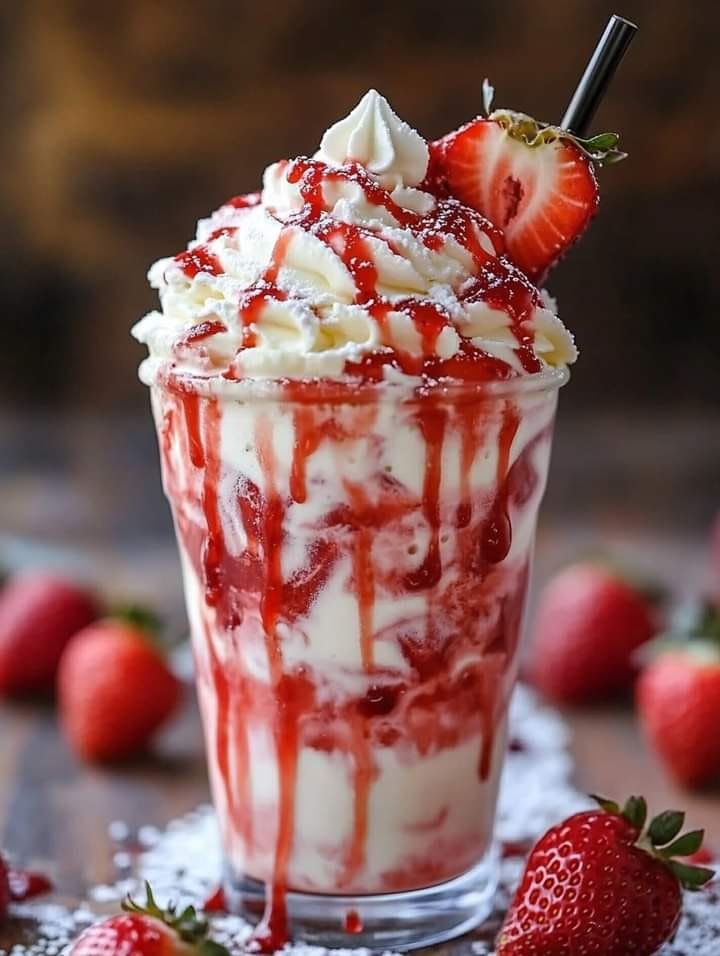 - Decorate: Drizzle strawberry syrup generously over the whipped cream. Garnish with fresh strawberry slices on top or on the rim of the glass for a beautiful presentation.
