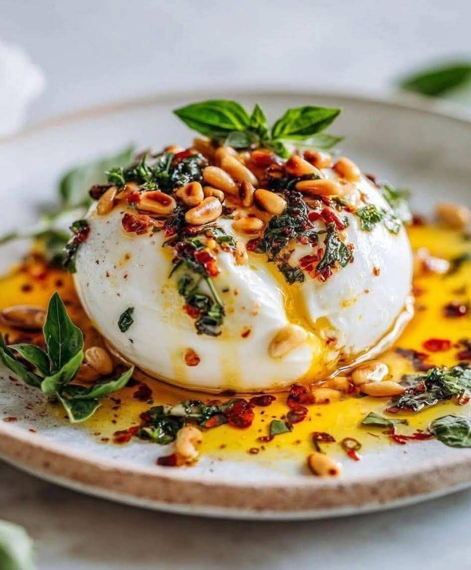 This dish truly encapsulates the magic of fresh, high-quality ingredients. What I love most about it is the incredible interplay of temperatures and textures: the warmth of the chili-infused oil gently melting the cool, creamy burrata, contrasting with the soft cheese, the delicate crunch of pine nuts, and the fresh pop of basil. The hot oil pour is simple, yet dramatic—aromatic and flavorful with every drop. It’s the ultimate “less is more” appetizer—fast, elegant, and endlessly satisfying. A warm pour, a cool center, a perfect crack of pine nut—pure Mediterranean bliss!