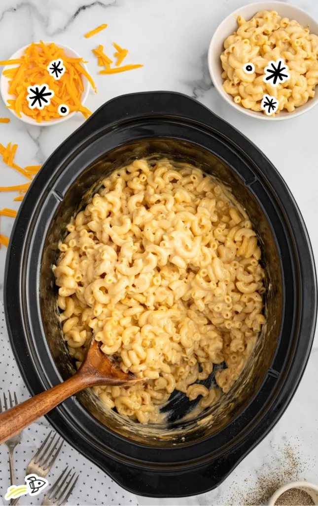 Before I add anything, I lightly grease the inside of the crockpot with butter or nonstick spray. This helps prevent the pasta from sticking or the cheese from burning on the sides.