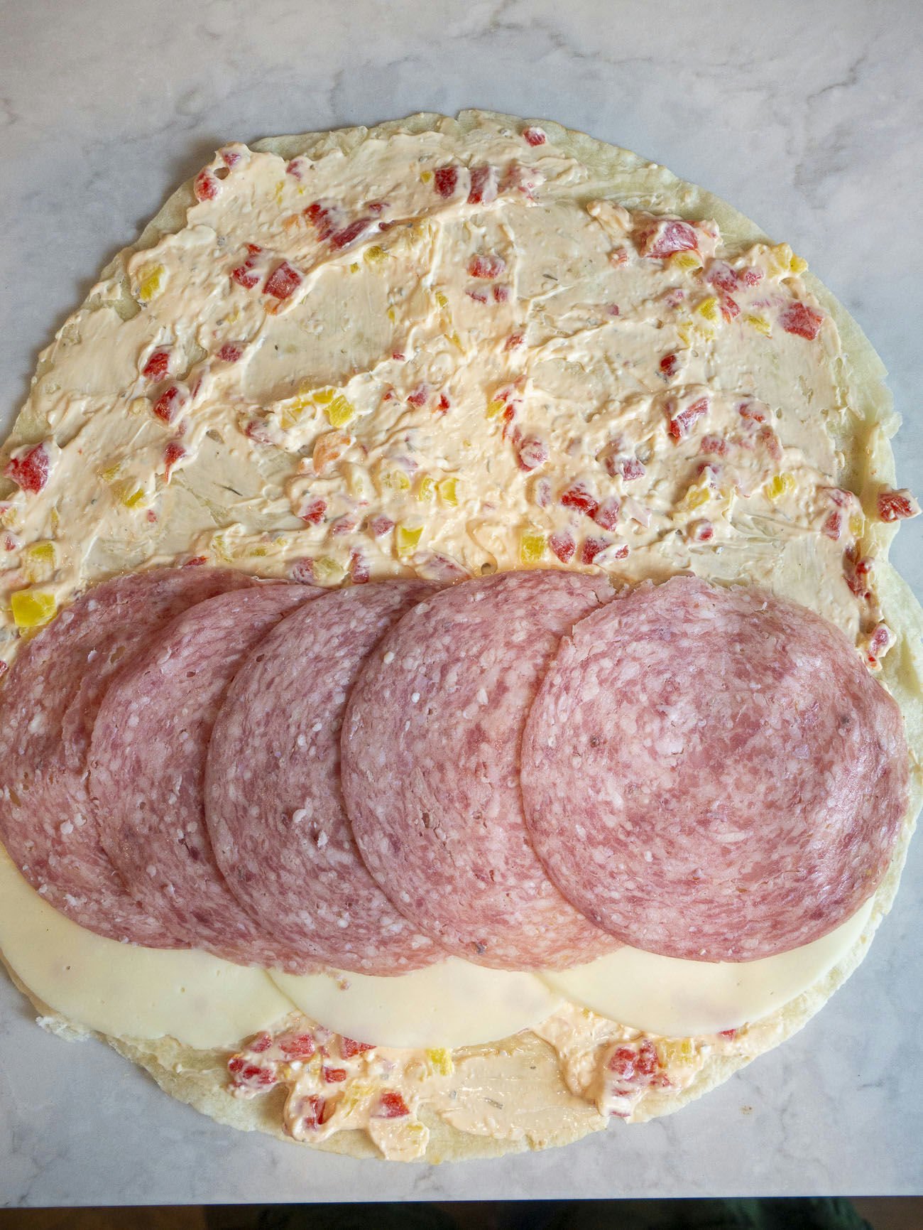 - Layer the Toppings: Layer the provolone cheese, salami, pepperoni, and deli ham evenly over the cream cheese mixture on each tortilla.