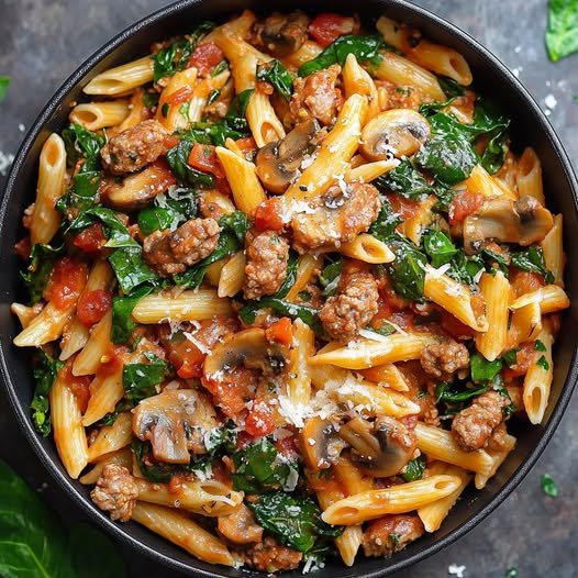 In just 30 minutes, you’ll be serving up al dente pasta tossed with savory sausage, sautéed mushrooms, and a rich tomato base, all brightened up with fresh spinach. It’s a flexible and comforting dish that’ll make it into your regular dinner rotation.