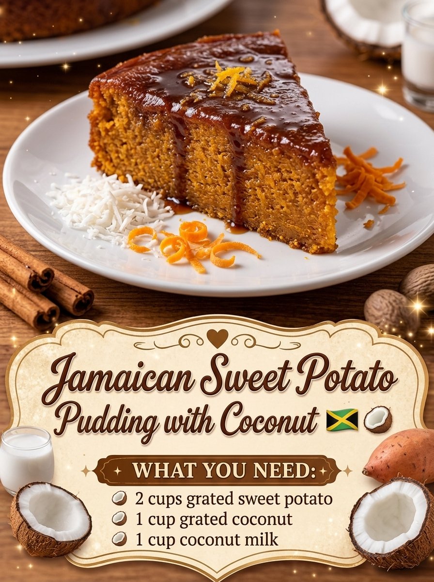 - Description: A rich, warmly spiced baked dessert made with sweet potato, coconut milk, and classic Caribbean flavor, with a soft, dense texture that makes every bite feel comforting and satisfying.