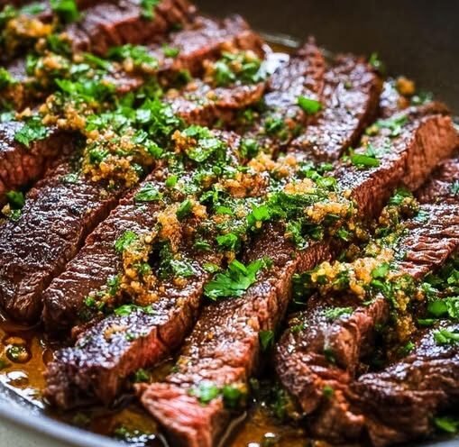 - Serve: Arrange the sliced steak on a platter and serve immediately, topped with fresh parsley or cilantro and a side of chimichurri sauce and lemon wedges.