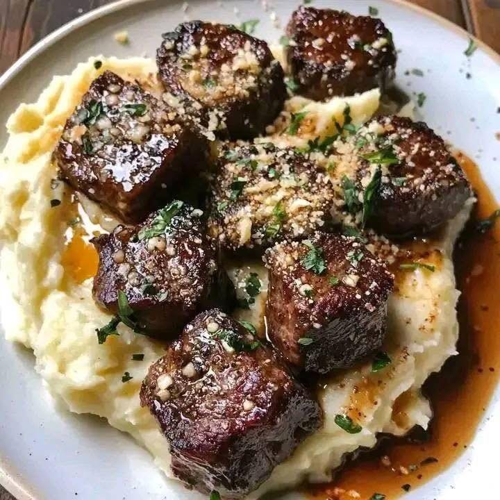 I spoon a big helping of mashed potatoes onto each plate, then pile the garlic Parmesan steak bites right alongside—or even on top, letting the sauce drip into the mash (trust me, this is the move).