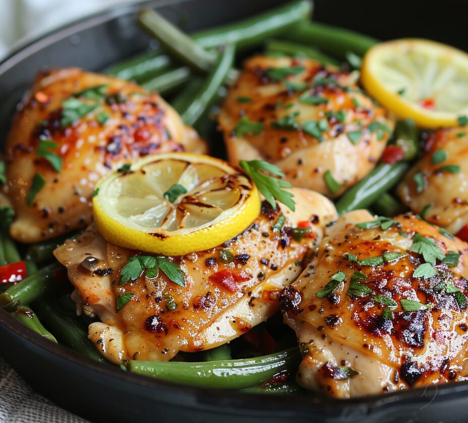 - Serve: Serve the lemon garlic butter chicken thighs and green beans warm. Garnish with more crushed chili pepper flakes, fresh parsley, and a beautiful slice of lemon if you like. Enjoy this delightful and flavorful meal!