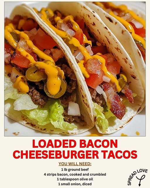 Why choose between a cheeseburger and tacos when you can have both? These Loaded Bacon Cheeseburger Tacos combine the best of both worlds—juicy, seasoned beef, crispy bacon, tangy pickles, melty cheddar cheese, and all your favorite burger toppings, served in a warm flour tortilla. It’s a bold, fun twist on two beloved classics and perfect for a quick family dinner, a party, or a game-day snack.