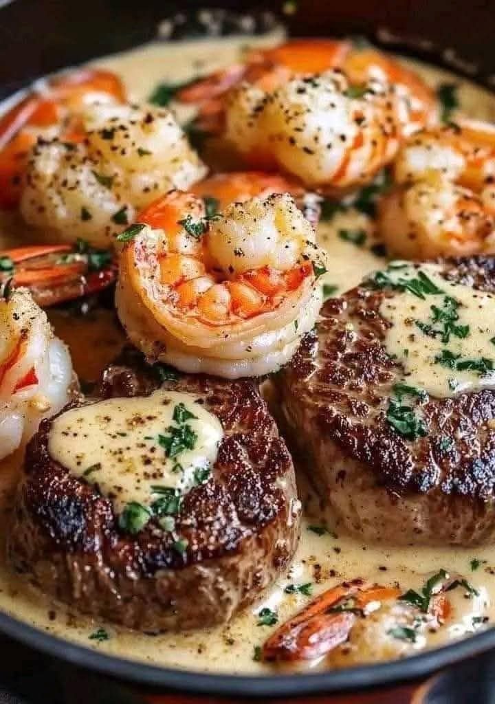 - Assemble and Serve: Plate each rested filet mignon steak. Spoon the warm shrimp and lobster cream saucegenerously over the top of each filet. Garnish with fresh chopped parsley for a pop of color and freshness. Serve immediately for the ultimate indulgent experience.
