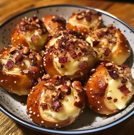 - Serve Warm: Remove from the oven and let them cool for just a minute or two (the filling will be very hot!). Serve these Maple Bacon Sophisticated Stuffed Pretzel Bites warm and enjoy the truly decadent combination of maple bacon, creamy cheese, and sweet pecans in each glorious bite!