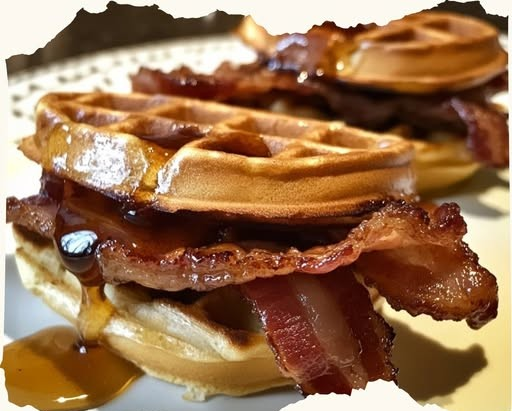 3. Drizzle with Maple Syrup: Generously drizzle maple syrup over the bacon and waffles.