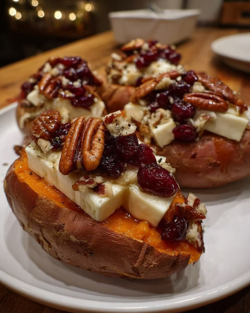 Maple Pecan & Brie Stuffed Sweet Potatoes with a Cranberry Glaze