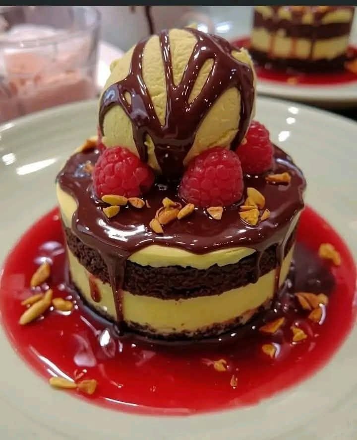 - Garnish: This is the showstopping part! Place a generous scoop of pistachio ice cream right on top of the cake. Arrange fresh raspberries around the ice cream and sprinkle chopped pistachios over the entire dessert.