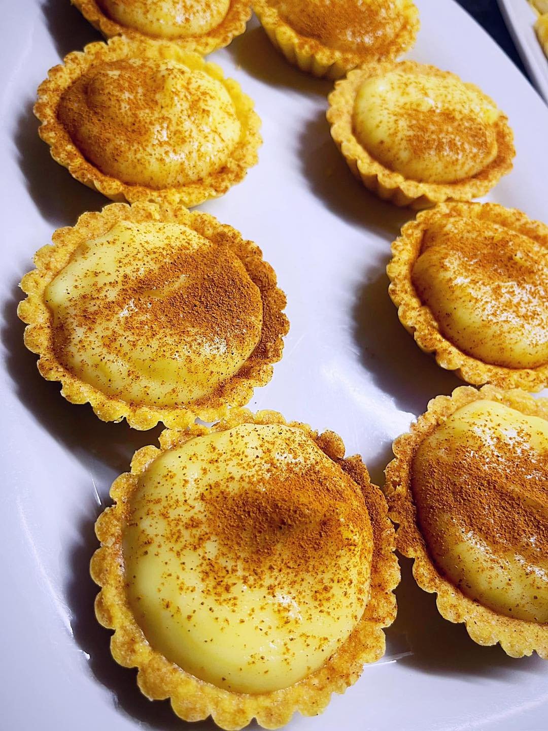 Pour the warm custard into the cooled tart shells. Smooth the tops and sprinkle generously with cinnamon.