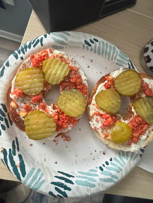 This Flamin’ Hot Pickle Bagel might look like a wild social media experiment, but the flavors are surprisingly balanced. The cream cheese cuts the heat, the pickles provide the acid, and the bagel provides the structure. It’s a fun, modern twist on a breakfast classic that I guarantee will have your friends asking for a bite.
