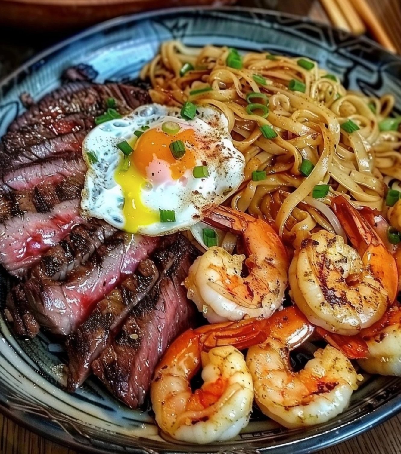 Place a generous mound of noodles on a plate. Layer the sliced steak and the shrimp on top. Add your soft-boiled egg (halved). Drizzle the entire dish with the seasoned melted butter for that final “wow” factor.