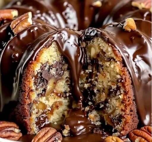 This cake bakes up golden and fragrant, with pockets of chocolate and nutty goodness in every slice. The rich glaze adds a fudgy finish that pushes it over the top. It’s the kind of dessert you cut “just a sliver” of—and then come back for three more.