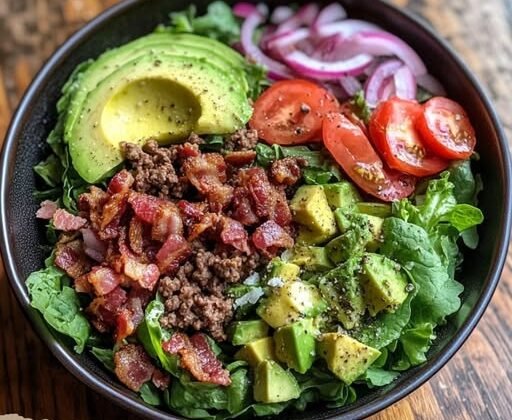 - Load with Toppings: Generously top each bowl of greens with the warm cooked ground beef, the crispy crumbled bacon, the creamy sliced avocado, the thinly sliced red onion, and the diced tomato.