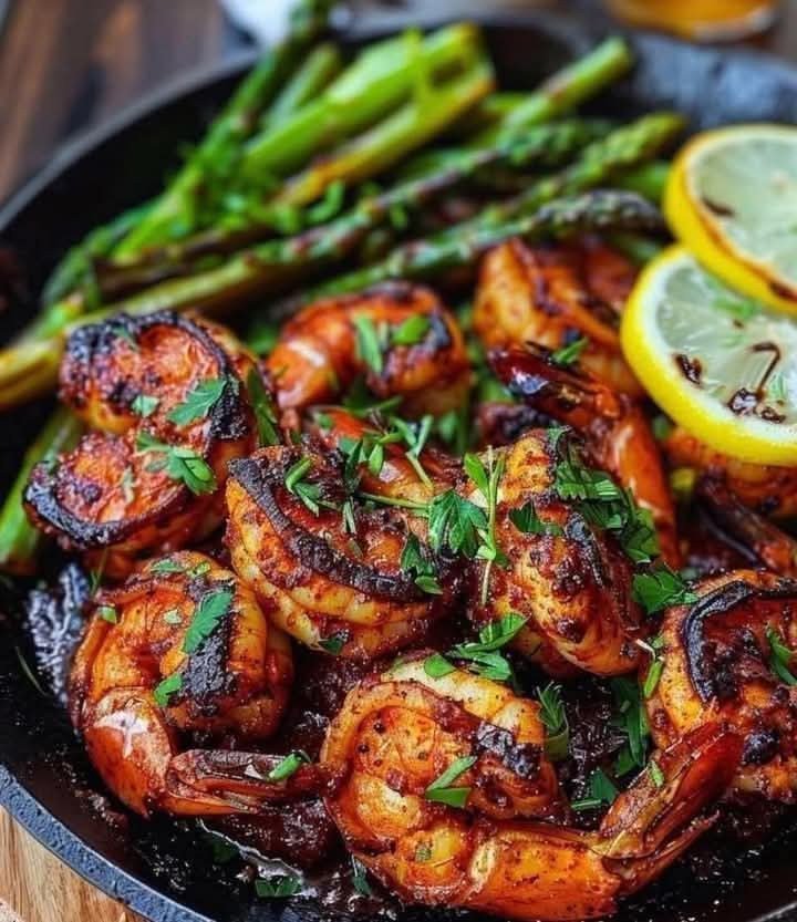 - Garnish and Serve: Remove the skillet from heat. Top generously with fresh chopped parsley, lemon slices, and crushed red pepper flakes if desired for a final touch of brightness and spice. Serve your blackened shrimp and asparagus immediately, and enjoy!