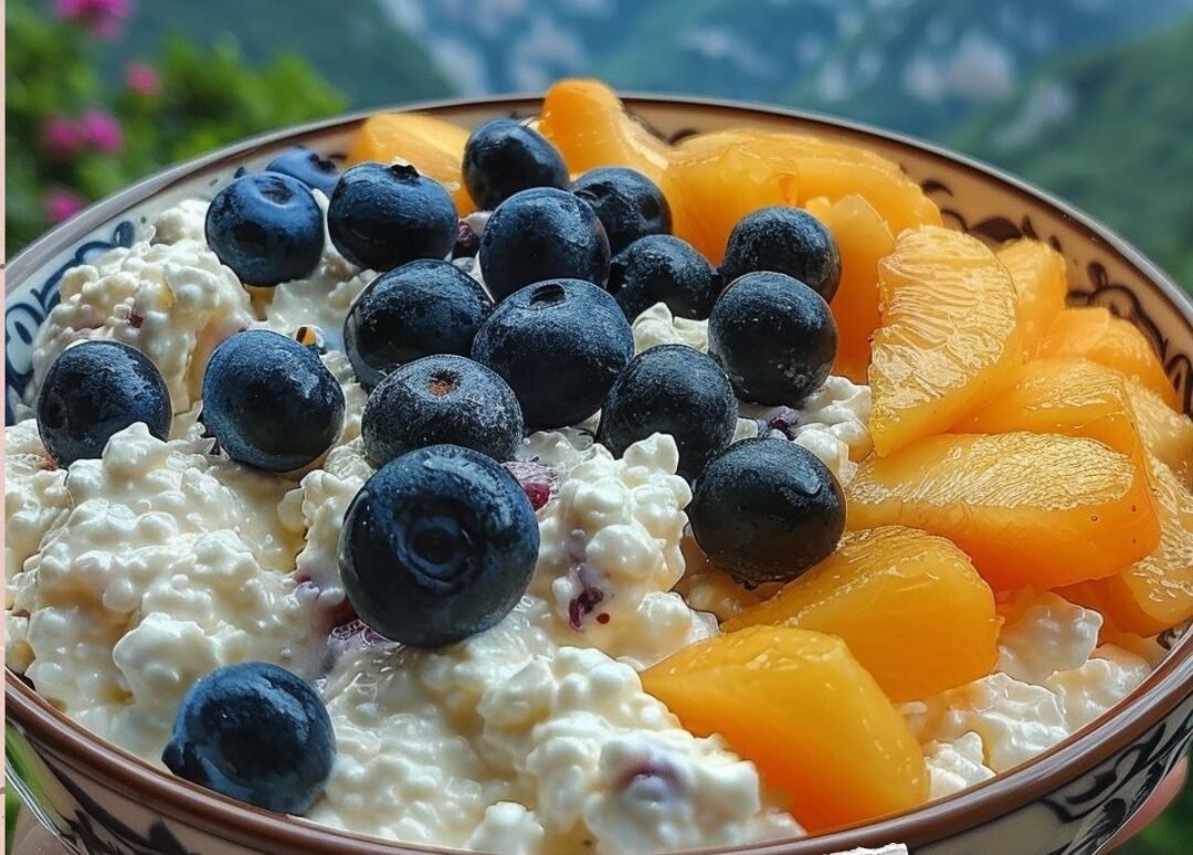 - Fold in Fruits: Gently fold in the chopped peaches and the 1 pint of fresh blueberries into the cottage cheese and pudding mixture. Stir carefully to distribute the fruit evenly without crushing the delicate blueberries.