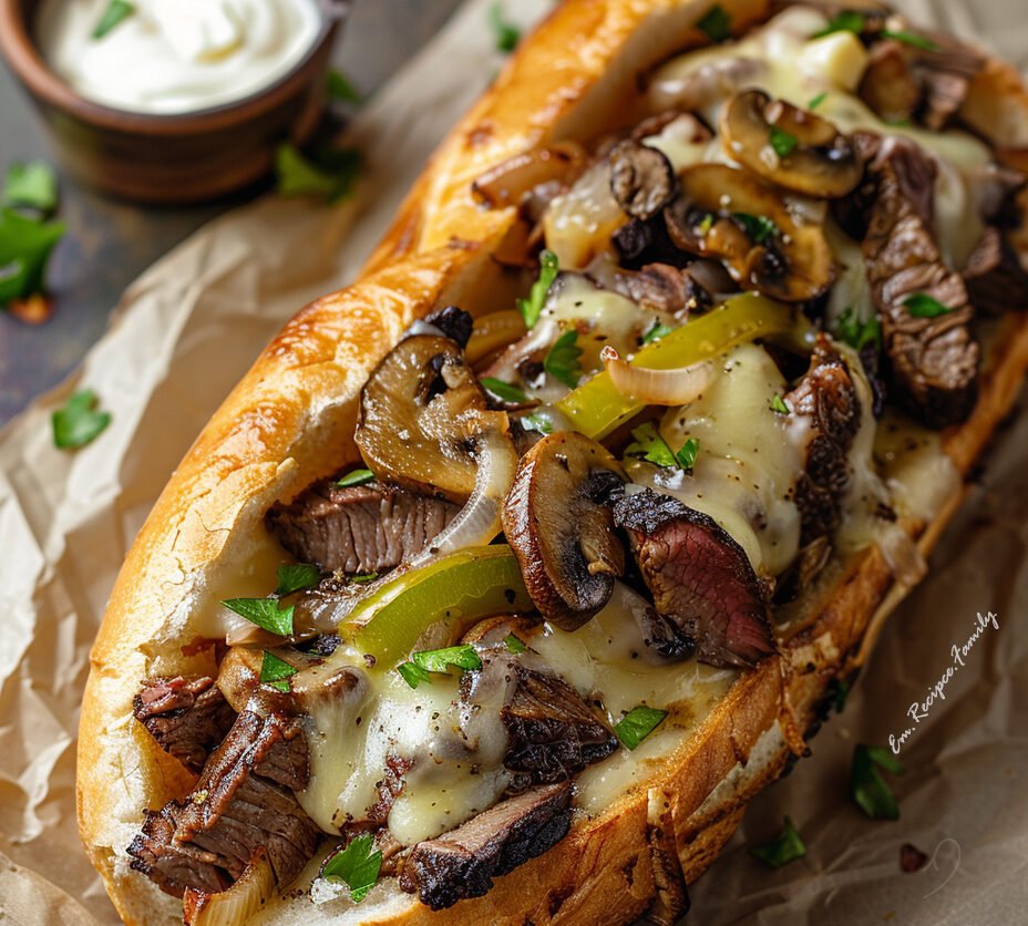 - Layer the Bread: Place half of the Provolone cheese slices evenly over the mayonnaise on both bread halves. Then, add the cooked steak mixture, followed by the cooked vegetables. Finally, top with the remaining Provolone cheese slices.