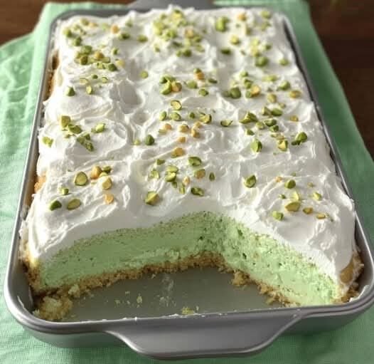 Spread the pistachio whipped topping evenly over the cooled cake.