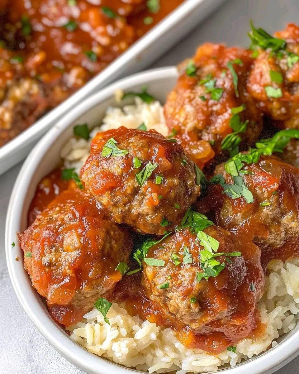 Remove the foil and bake for an additional 15–20 minutes, or until the meatballs are cooked through and rice is tender.