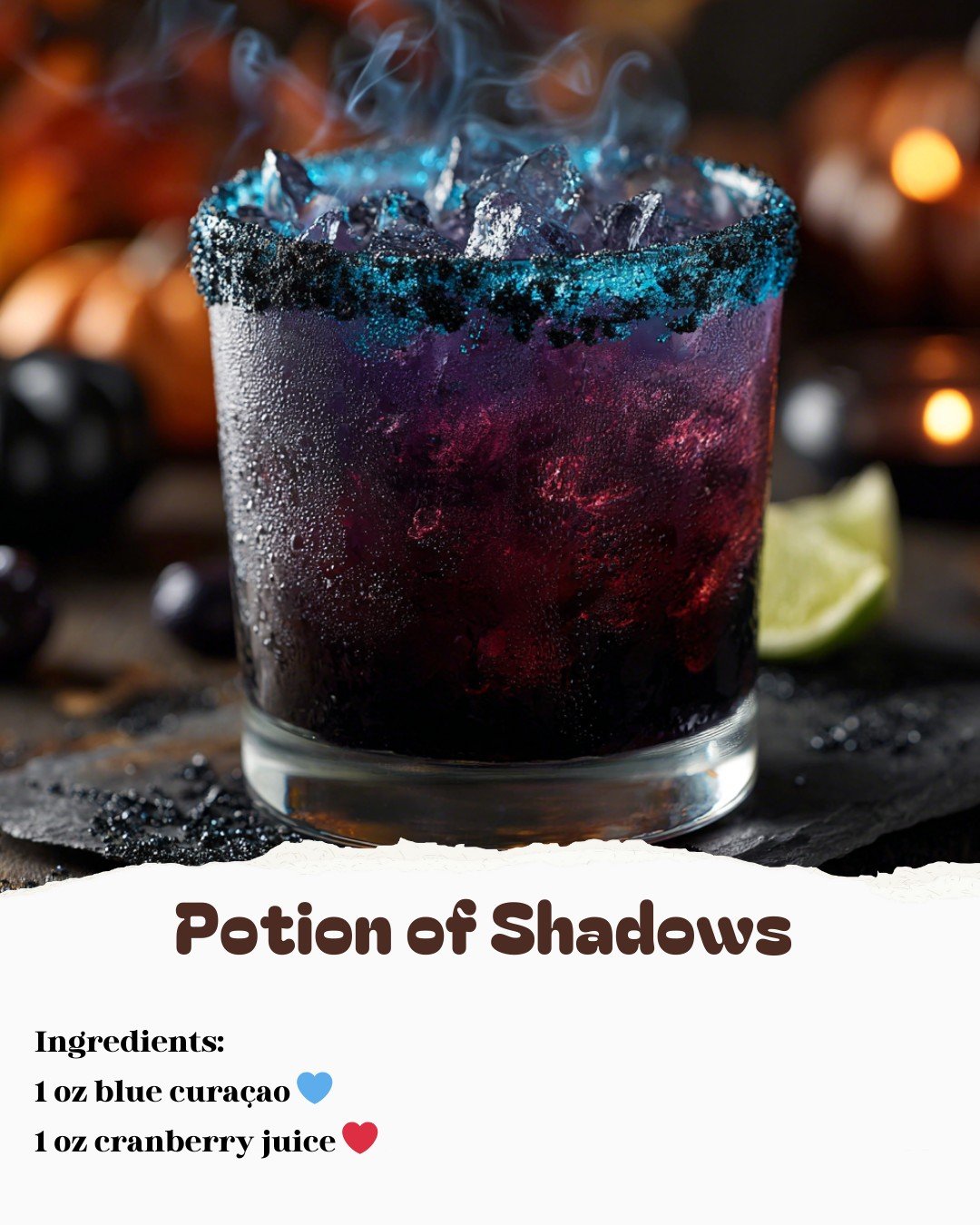 • The Mocktail Version: To make this an equally dramatic “Potion of Shadows” Mocktail, swap the vodka and blue curaçao for 3 oz Dark Grape Juice and a 21​ oz of Lemon-Lime Soda (or simple syrup for sweetness), keeping the 21​ oz lime juice. Use the tonic water splash to keep the glow factor!