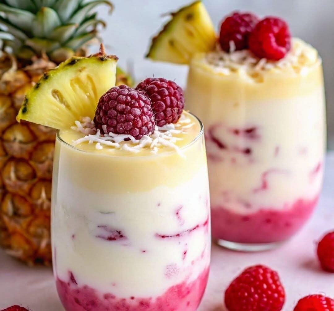 - Top with shredded coconut, a few fresh raspberries, and a pineapple wedge for a fun tropical finish.