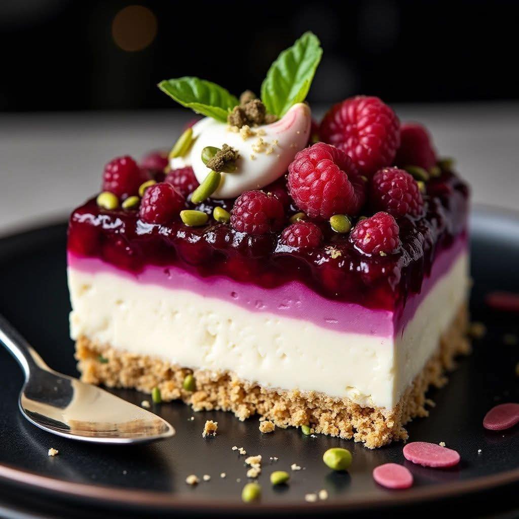 Just before serving, top the cheesecake with fresh raspberries and chopped pistachios. Drizzle with honey for a luscious finish.