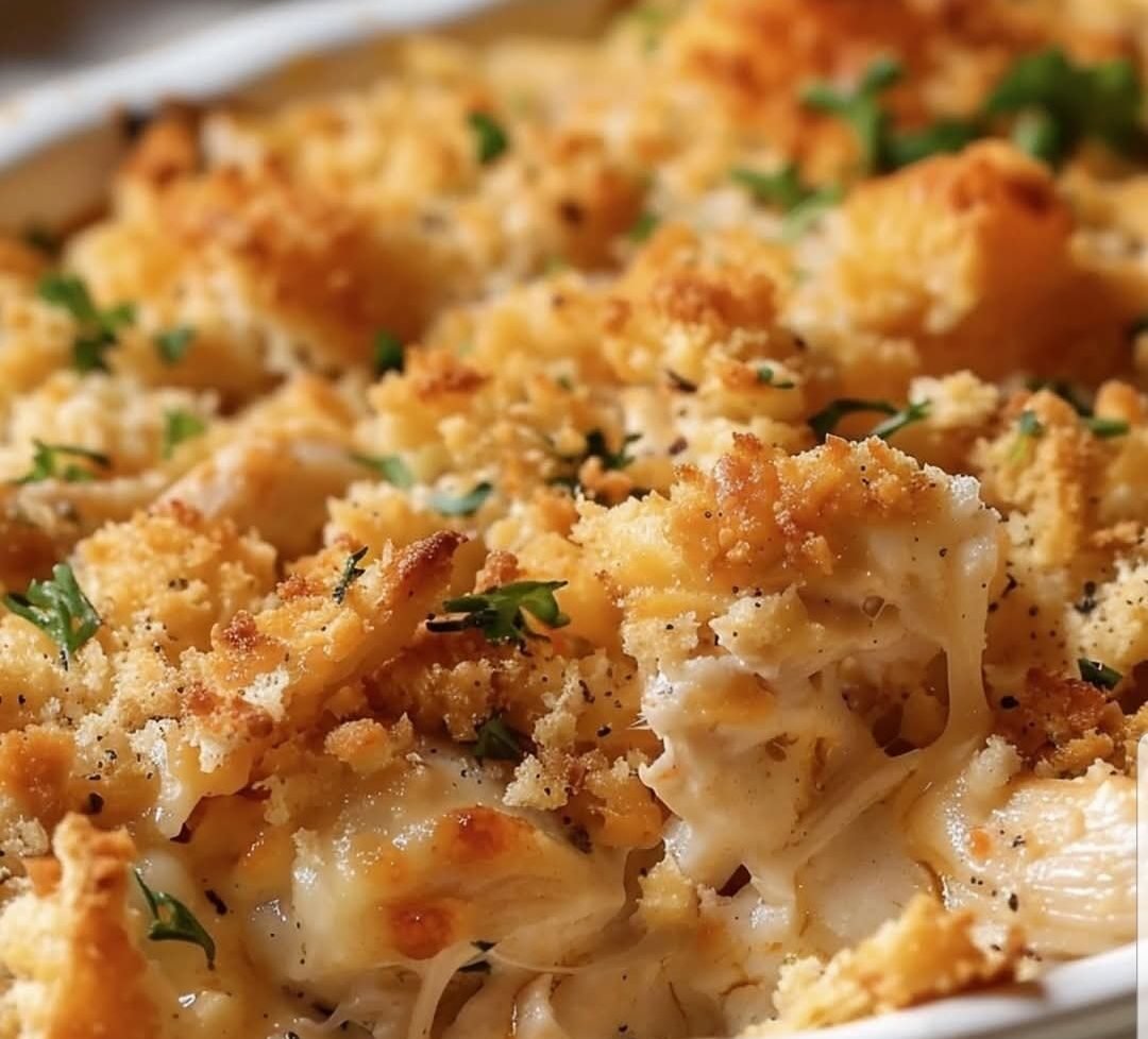 - Bake uncovered for 35–40 minutes, or until chicken is fully cooked (internal temp of 165°F) and the topping is golden brown.