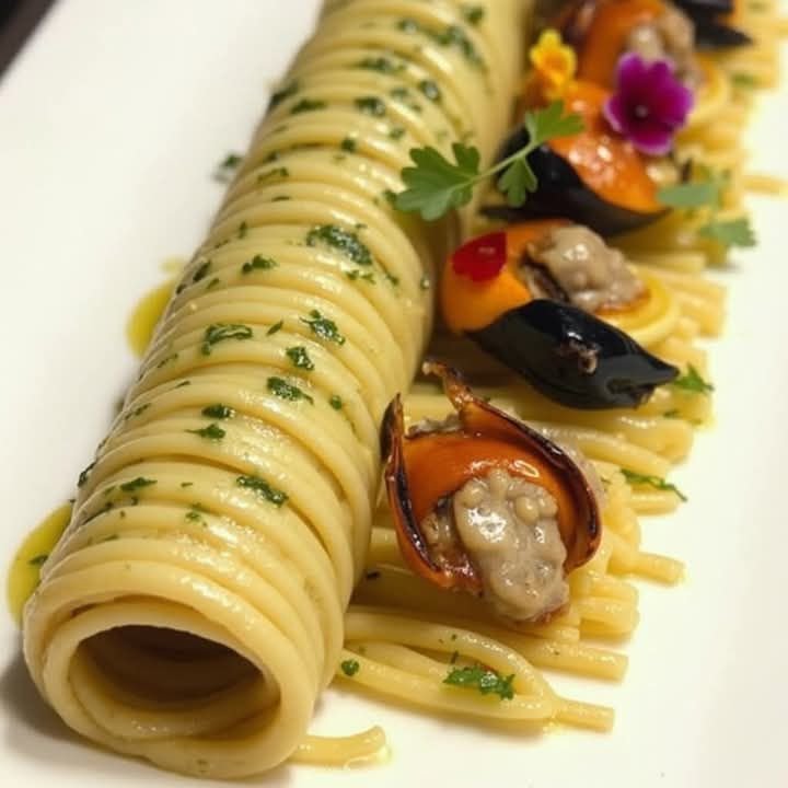 Rolled Spaghetti with Mussels & Herb Oil 🐚🌿