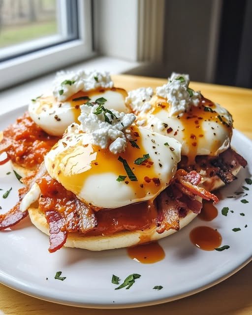 - Flavor Fusion Masterpiece: It marries the rustic, spiced tomato base of shakshuka with the classic poached egg and English muffin, then elevates it with crispy bacon and tangy feta. It’s a symphony of tastes!
