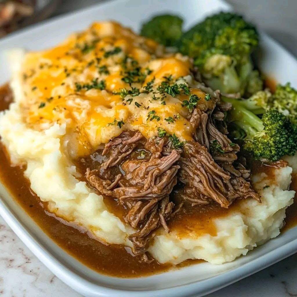 Slow-Cooked Shredded Beef with Creamy Mashed Potatoes and Broccoli Bake