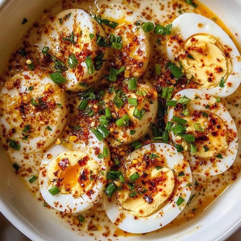 4. Drizzle and Soak: Carefully pour the spicy garlic chili sauce generously over all the arranged egg halves. Ensure each egg half gets a good coating of the flavorful sauce and chili flakes. Let the eggs sit for a few minutes (at least 5-10 minutes) to absorb the delicious flavor – the longer they rest, the spicier and more flavorful they’ll become!