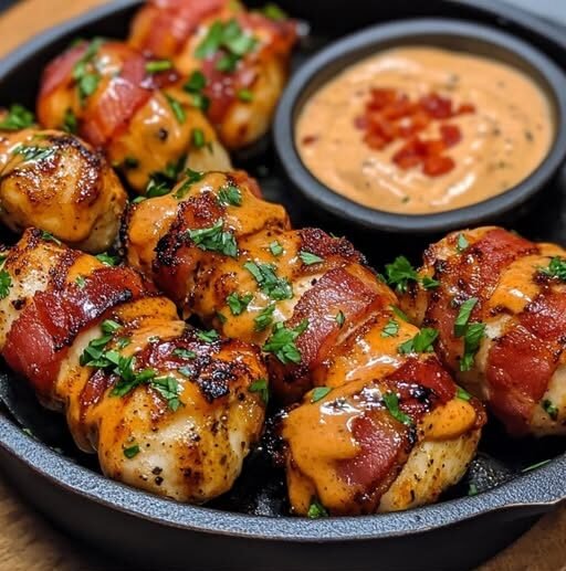 You know a dish is a crowd-pleaser when it disappears before you even set down the tray. These Sriracha Honey Bacon-Wrapped Chicken Bites are fiery, sticky, and smoky — the holy trifecta of flavor. Paired with a cool, tangy Creamy Pimento Dip, they’re the MVP of your next game day, BBQ, or anytime-you-want-to-wow snack platter.