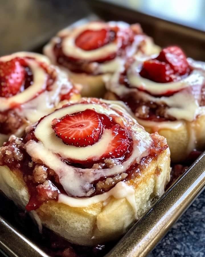 You can also prepare parts of this recipe ahead of time. The strawberry topping can be made in advance and chilled, and the rolls can be assembled before baking and refrigerated overnight. Just let them sit at room temperature briefly before baking the next day.