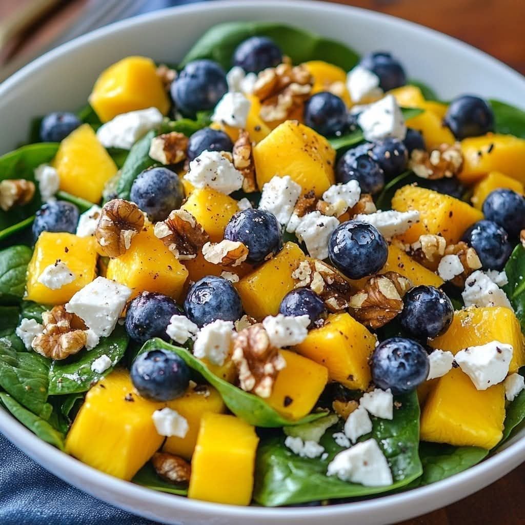 This salad is one of those rare gems that hits every flavor note: sweet mango, juicy blueberries, creamy feta, earthy spinach, and the irresistible crunch of toasted walnuts. It’s like a summer day in a bowl! I often make this when I need a quick yet impressive dish, and it pairs beautifully with everything from grilled proteins to wraps and sandwiches.