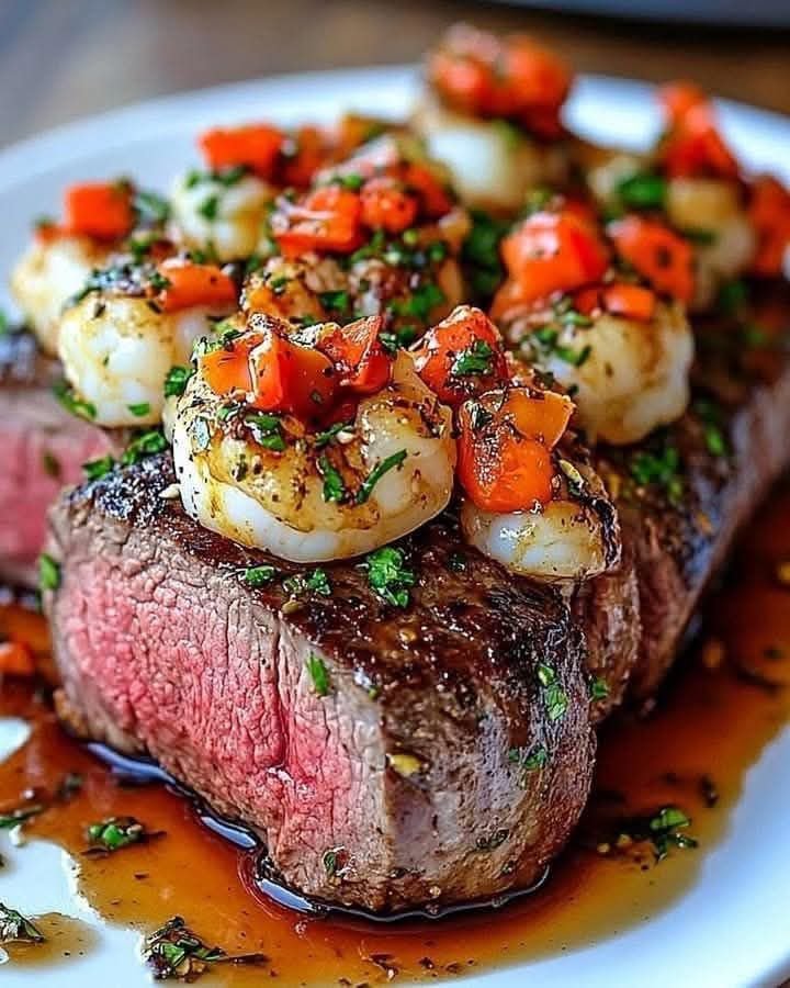 There’s something undeniably indulgent about combining land and sea in a single dish. The tender filet mignon provides a melt-in-your-mouth base, while the sautéed shrimp with tomatoes, garlic, and lemon delivers a bright, savory lift. The final drizzle of beefy Worcestershire butter sauce ties everything together like a fine ribbon on a gourmet gift.