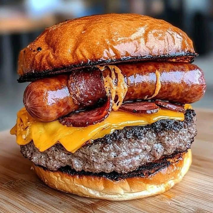 The Ultimate Burger: Beef, Cheddar & Sausage Stack 🍳🧀