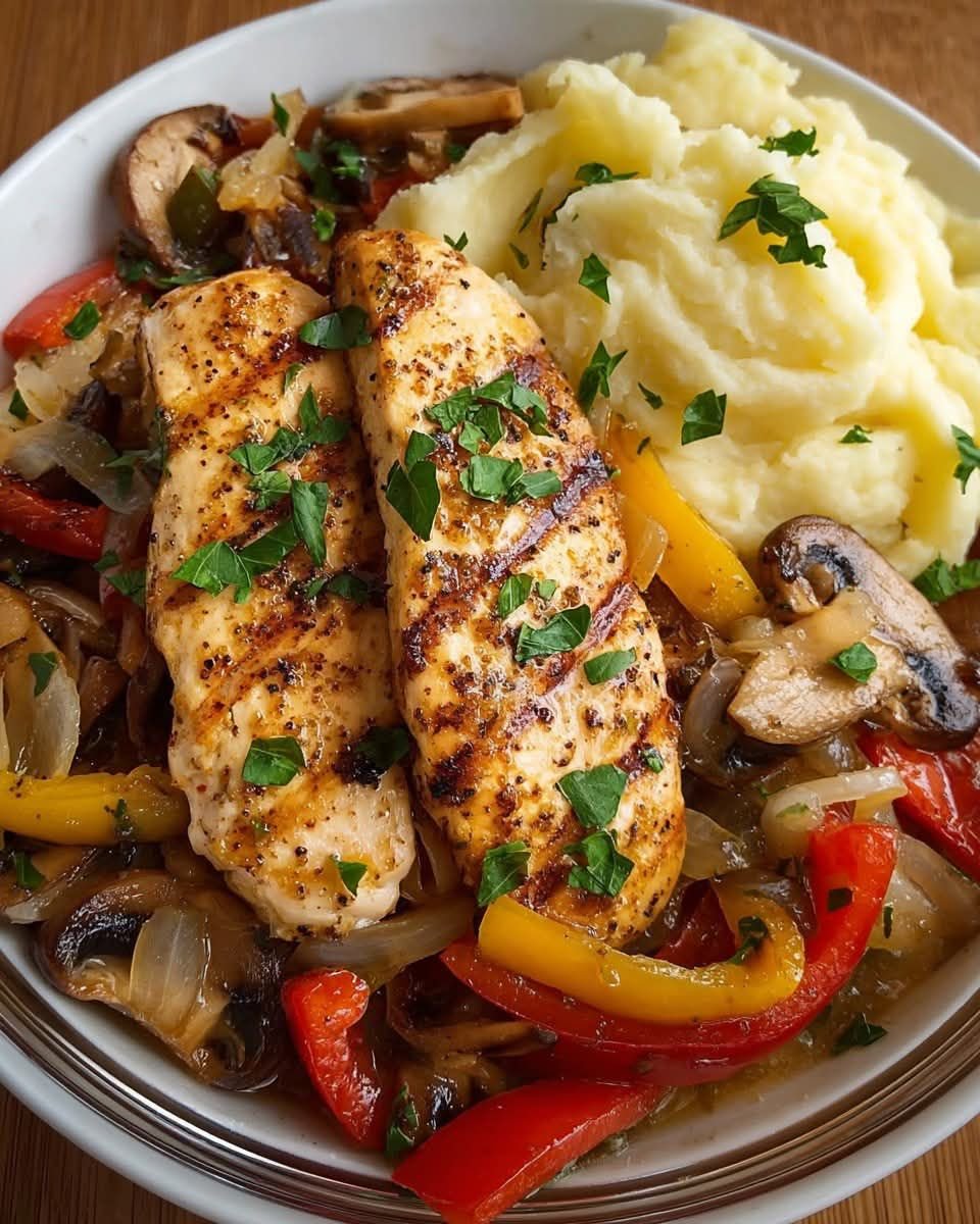 Some meals just feel like a classic for a reason. This Pan-Seared Chicken with a Creamy Mushroom-Pepper Sauce is a perfect example. It’s a hearty, flavorful, and incredibly satisfying dinner that’s perfect for a cozy night in. The chicken is pan-seared to a beautiful golden brown, and it’s all smothered in a rich, savory sauce that’s loaded with tender onions, peppers, and mushrooms. Served alongside a generous portion of creamy mashed potatoes, this meal is a true comfort food masterpiece.