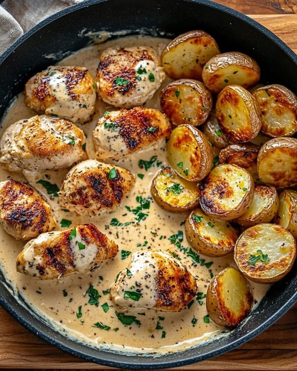 The Ultimate One-Pan Creamy Garlic Chicken with Golden Potatoes