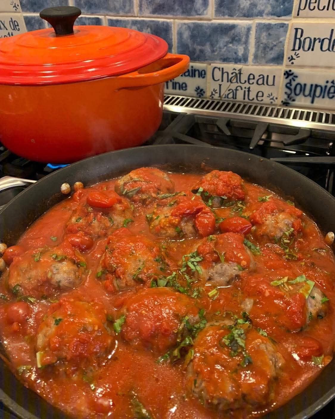5. Simmer with Meatballs: Carefully add the baked meatballs and a few fresh basil leaves to the sauce. Reduce the heat to a very low simmer. Cover the pot and let the sauce simmer for 45 minutes, stirring occasionally. Use a wooden spoon and stir slowly and gently to avoid breaking up the meatballs.