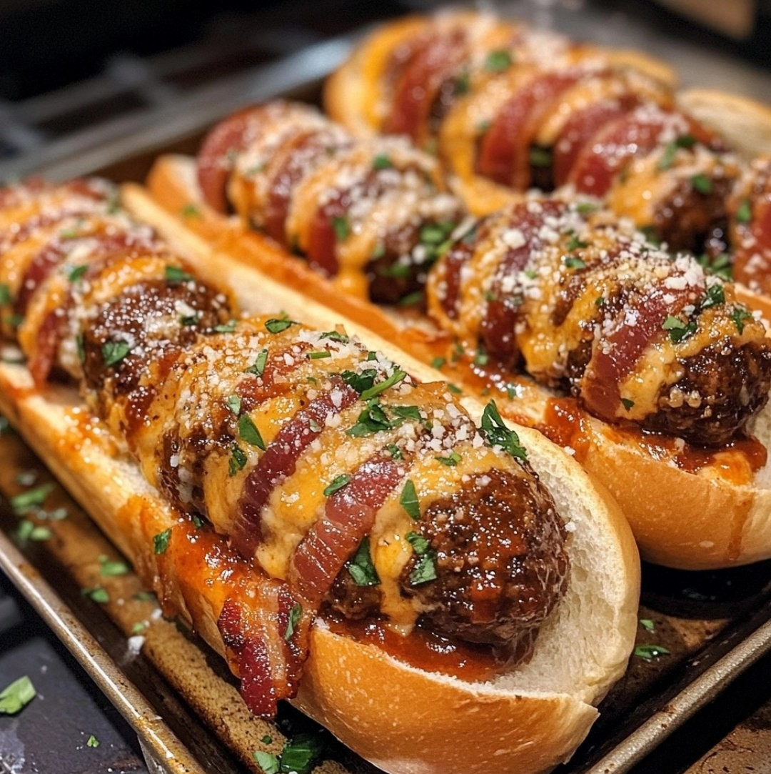 If smoky-sweet BBQ sauce, gooey melted cheddar, and crispy bacon sound like your ideal flavor combo—get ready to fall in love. These Cheesy BBQ Bacon-Wrapped Meatball Subs take everything you crave in a hearty sandwich and crank it to eleven. Each meatball is wrapped in bacon, baked to golden perfection, tossed in rich BBQ sauce, then piled into toasted sub rolls and blanketed with cheese. It’s big flavor, big comfort, and totally unforgettable.