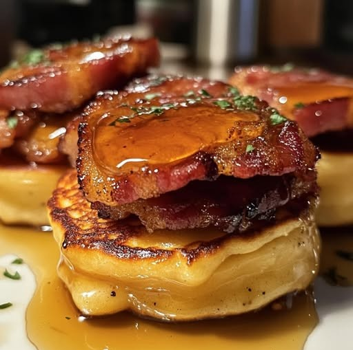 These little pancake sandwiches are magic. They’re sweet, savory, sticky, and just the right size for snacking or stacking high on a brunch board. The smoky crunch of the bacon against fluffy pancakes and silky honey butter? Absolute perfection.