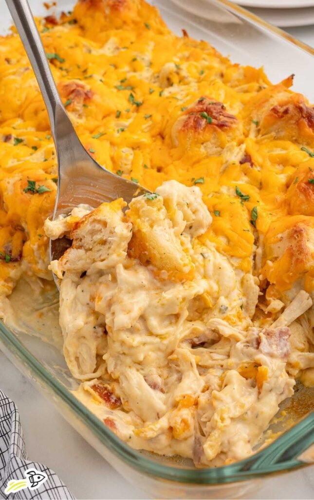 I quarter each biscuit and gently fold the pieces into the chicken mixture. The goal is to coat every piece in that creamy, cheesy sauce without tearing them up too much.