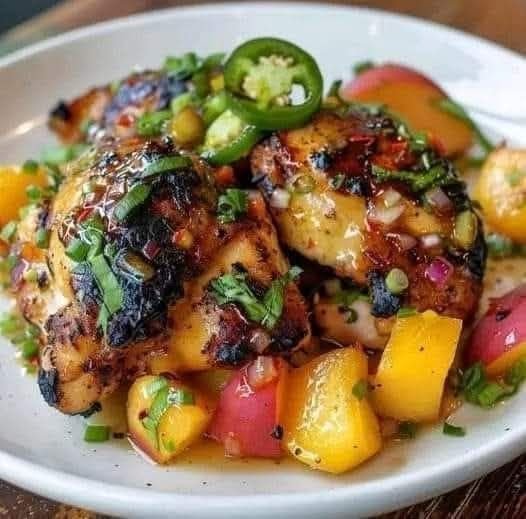 This dish hits all the right notes: savory, sweet, tangy, and spicy. The chicken thighs stay tender and juicy, the glaze thickens to a sticky finish that caramelizes beautifully on the grill, and the fresh peaches and jalapeños create a vibrant topping that feels fancy but takes just minutes to make. It’s ideal for casual cookouts, date night, or even a midweek dinner that tastes like a weekend celebration.