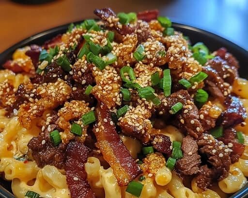 This isn’t your boxed mac and cheese. It’s a fusion feast in one skillet, combining the sticky-sweet bite of Korean BBQ sauce with crispy bacon and a rich cheddar cheese base. The result? A comforting, flavor-loaded meal with just the right amount of edge.