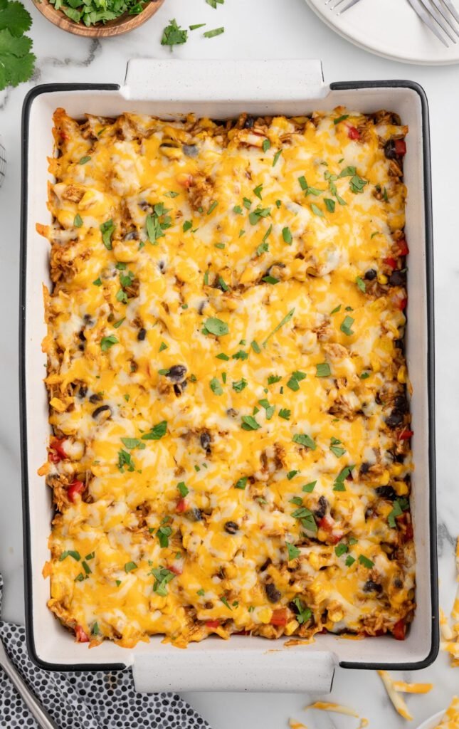 I let the casserole sit for 5–10 minutes to set before serving. Then I top it with green onions, cilantro, and maybe a few sliced jalapeños if I want to spice things up.