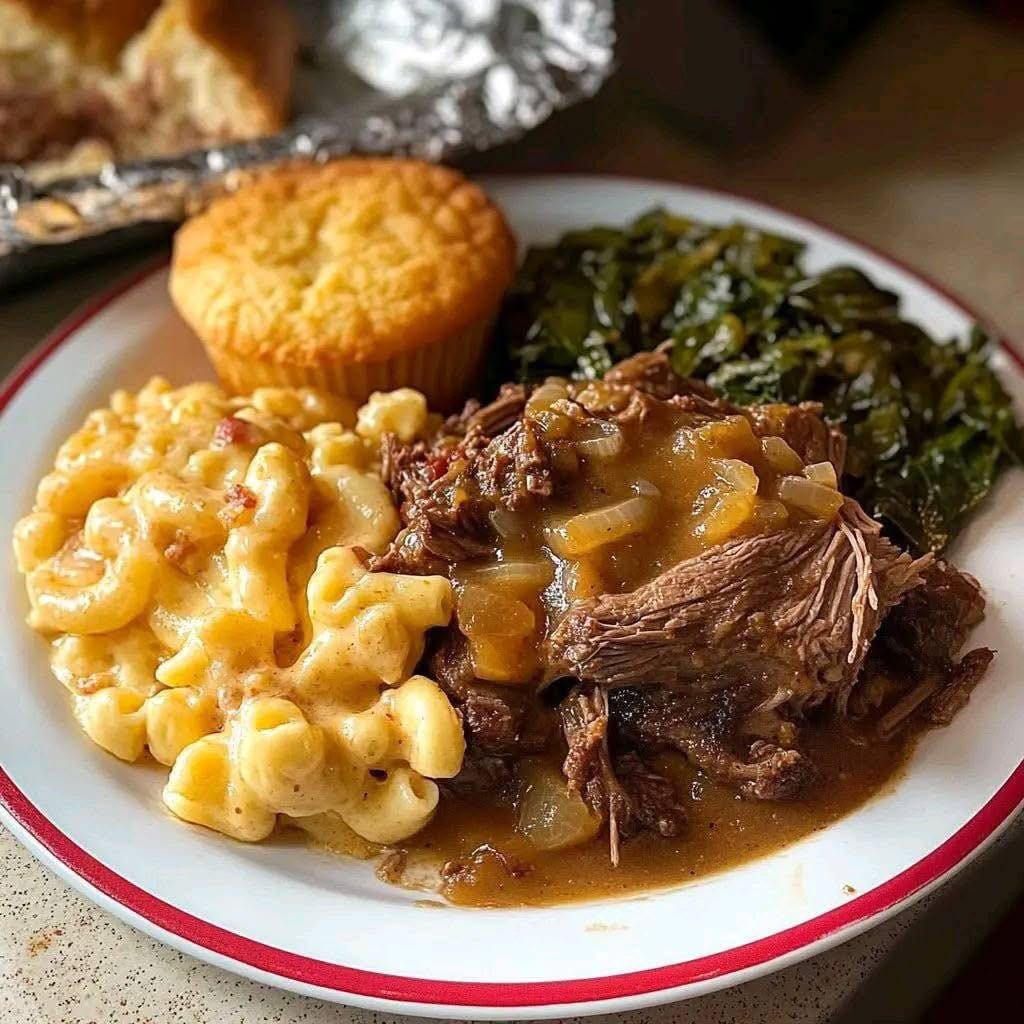 Nothing says comfort like a Southern-style pot roast dinner, complete with baked mac and cheese, tender collard greens, and warm cornbread muffins. This meal is the definition of soul food—a hearty, slow-simmered beef roast with bold flavor, paired with Southern staples that turn your plate into a down-home feast.